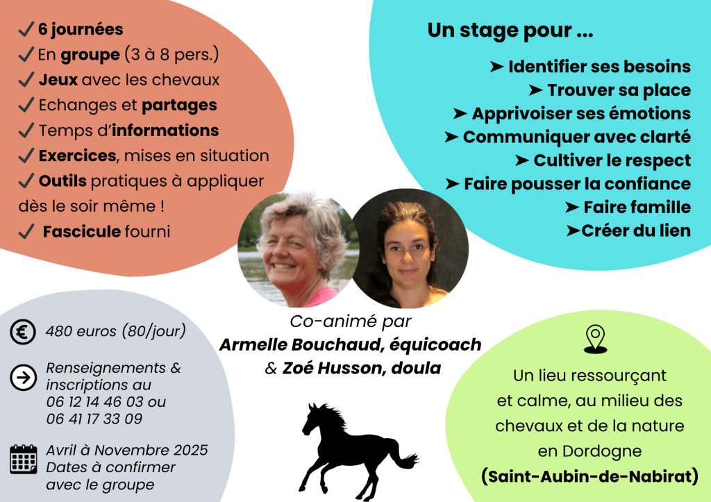 Armelle Bouchaud, ancienne infirmière et équithérapeute (https://cheminer-aveclecheval.jimdofree.com/), et Zoé Husson, docteure en neurosciences et doula, proposent des stages de soutien à la parentalité par la médiation équine. Les 6 journées de stages en petits groupes sont rythmées par des jeux avec les chevaux, des temps d’échanges, de partages et d’informations, et la pratique d’exercices et d’outils pratiques à appliquer dès le soir même dans votre quotidien de parents ! A l’issu de ces journées, vous vous serez offert un temps précieux de cheminement vers vous-même pour mieux cheminer avec votre enfant.